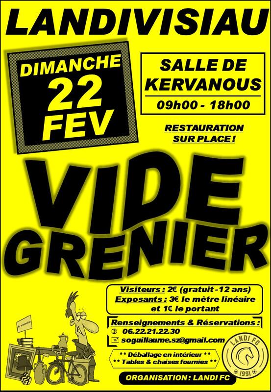 15ième édition du vide-grenier organisé par le landi fc ; salle de kervanous (près du centre E.Leclerc) à landivisiau ; accueil des exposants à partir de 07h00 ; ouverture au public de 09h00 à 18h00 ; 2 salles couvertes ; 300m de déballage en intérieur + déballage extérieur ; restauration sur place (boissons, barbecue, sandwichs, frites, crêpes, etc.)