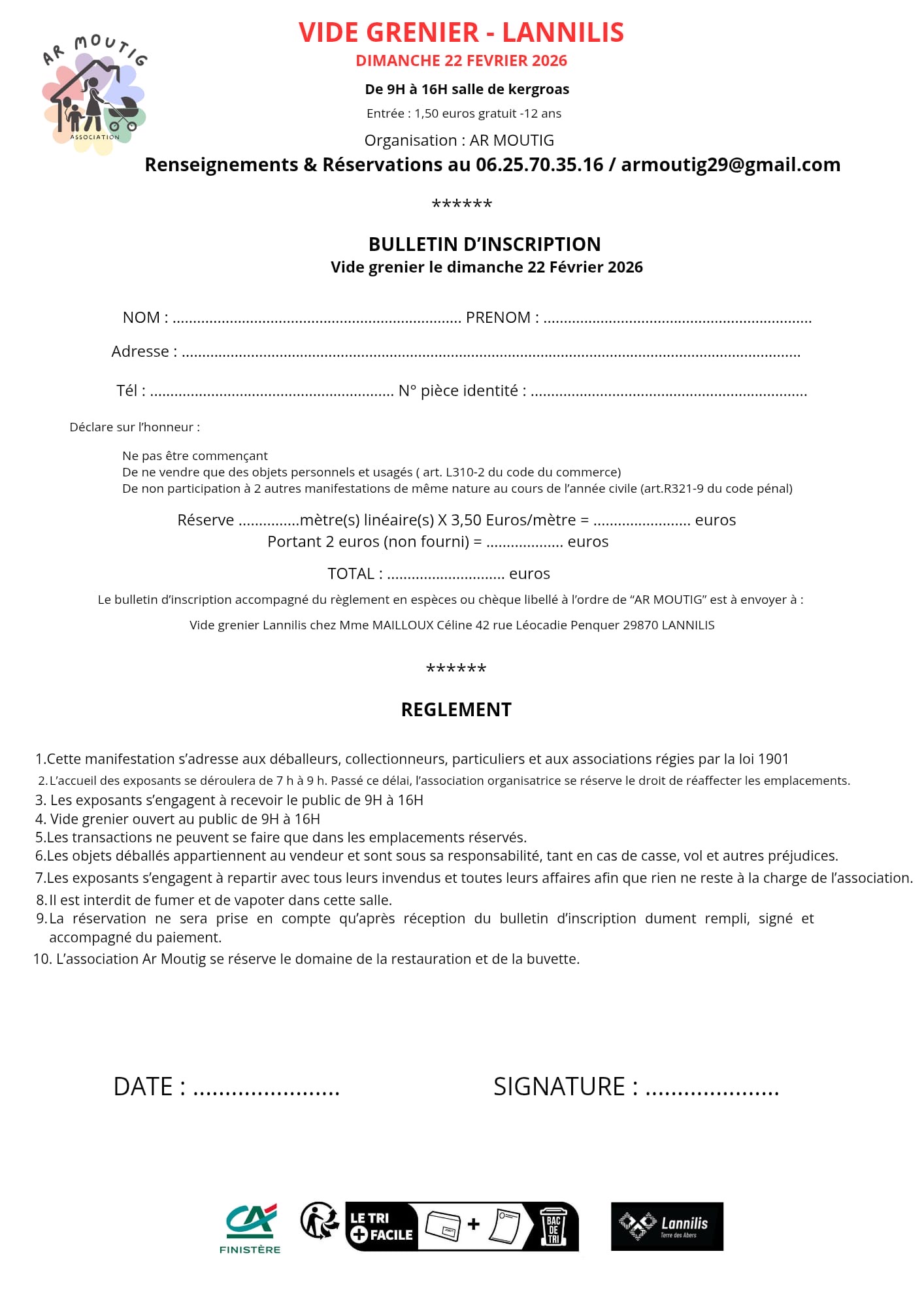 L'association ar moutig organise son vide grenier annuel le dimanche 22 février 2026 de 9h à 16h, à la salle kergroas. Restauration sur place (crêpes, sandwich, gâteaux...) salle chauffée.
