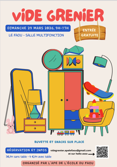 l'association des parents d'élève de l'école du faou organise son vide grenier. Les fonds récoltés contribueront au financement des activités et sorties pédagogiques de l'école.