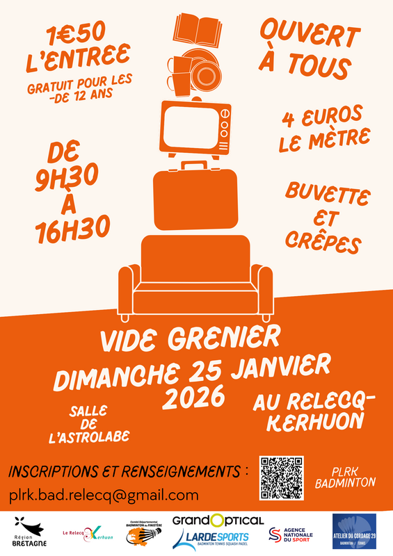 Vide grenier à la salle de l'astrolabe du relecq-kerhuon, le dimanche 25 janvier de 9h30 à 16h30. Entrée à 1€50 (gratuit pour les moins de 12 ans). Buvette sur place (boissons, crêpes, sandwichs).