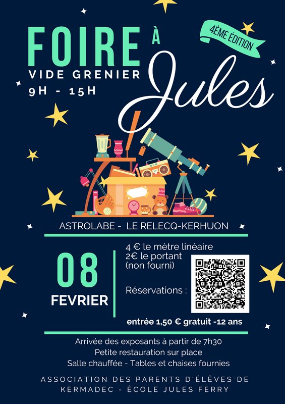 L'apek (association des parents d'élèves de kermadec) organise la 4ème édition de la foire à jules ! Ce vide grenier se tiendra le dimanche 8 février 2026 de 9h00 à 15h00 à l'astrolabe - salle dumont d’urville (bas) et salle la perouse (haut) - au relecq-kerhuon.