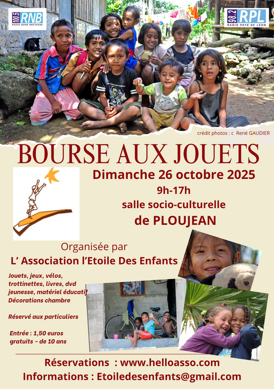 Première bourse aux jouets organisée par l'association au bénéficie des enfants défavorisés ppour financer des actions humanitaires à madagascar, au laos, au burkina faso et en inde. Les objets à exposer pour la vente sont : jouets, jeux, vélos, trottinettes, livres, dvd jeunesse, matériel éducatif, décorations de chambres...Entrée gratuite pour les moins de 10 ans