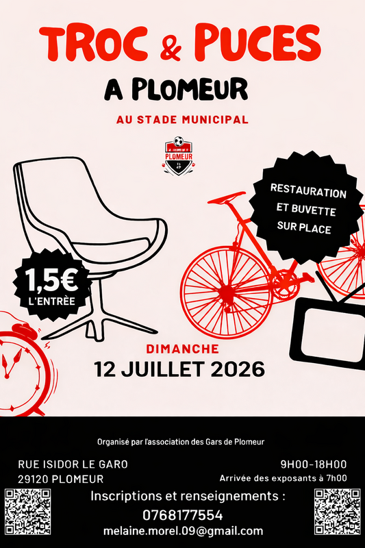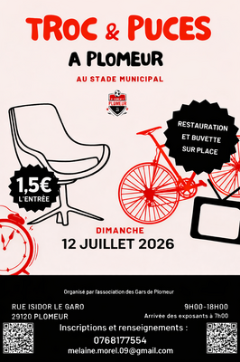 Troc & puces à plomeur envie de chiner, vendre ou simplement passer un bon moment ? Ne manquez pas notre grand troc & puces ! Dimanche 12 juillet 2026 stade municipal de plomeur de 9h à 18h.