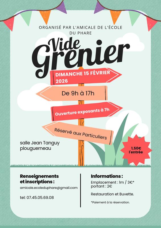 Vide grenier organisé par l’amicale de l’ecole du phare de plouguerneau, le dimanche 15 février 2026 de 9h00 à 17h00 à la salle jean tanguy.