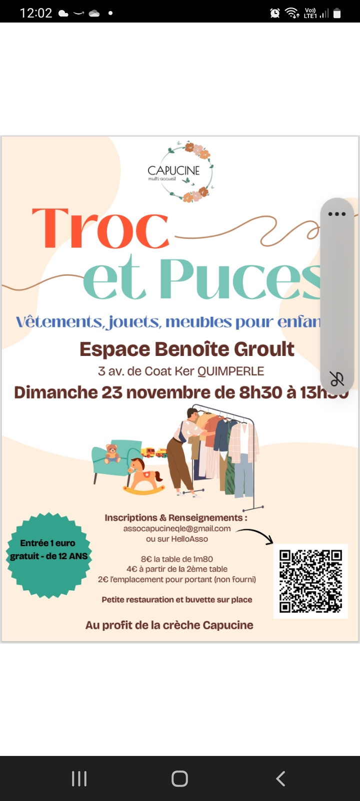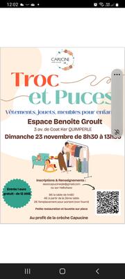 L’association la crèche capucine organise son troc et puces pour récolter des fonds pour les activités des enfants, le dimanche 23 novembre 2025 à la salle benoîte groult de quimperlé de 8h30 à 13h30.