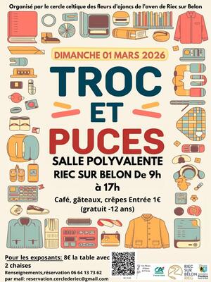 Troc et puces dimanche 1er mars 2026 à la salle polyvalente de riec sur belon de 9h à 17h organisé par le cercle celtique de riec sur belon