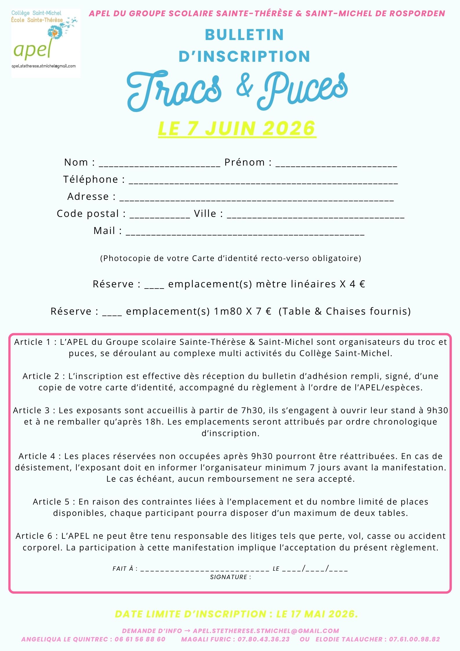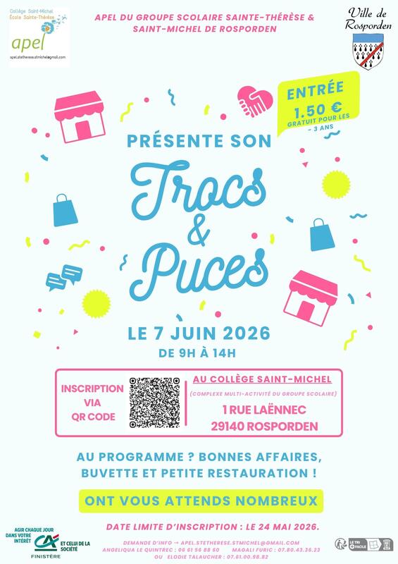 Dimanche 7 juin 2026 de 9h à 14h complexe multi-activité du groupe scolaire sainte-thérèse & saint-michel de rosporden. * petite restauration & buvette sur place *