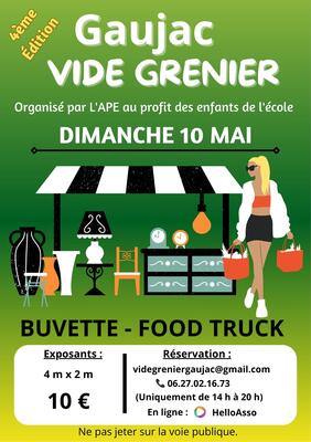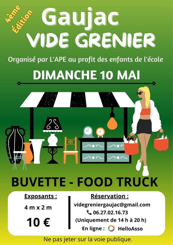 vide-greniers en extérieur au milieu du cœur du village de gaujac. Buvette sur place (petit-déjeuner, café, boissons) et food-trucks (pizza et/ou burgers)