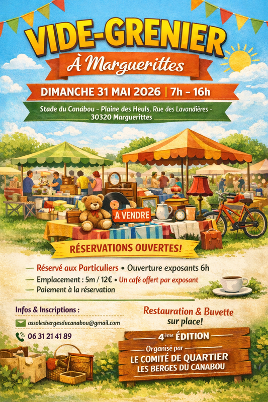 Vide-grenier à marguerittes dimanche 31 mai 2025 | 7h - 16h stade du canabou - plaine des heuls, rue des lavandieres - 30320 marguerittes.