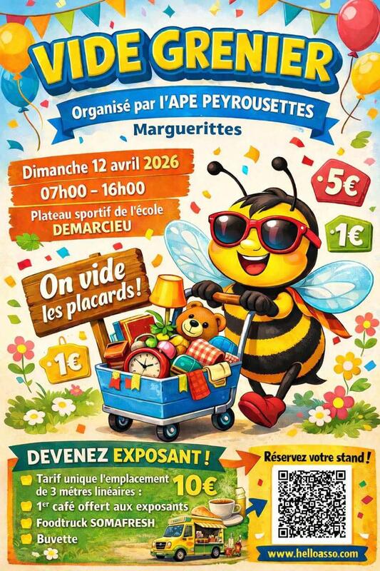Venez chiner et soutenir l’école maternelle peyrousettes ! Dimanche 12 avril 2026, au plateau sportif de l’école demarcieu à marguerittes, de 07h à 16h. Derrière chaque jouet, livre ou vêtement trouvé se cache une bonne action : financer les projets scolaires, la sortie de fin d’année et la fête de l’école. Faites de la place chez vous, dénichez des trésors et passez une journée conviviale sous le soleil (ou sous la tente ) !