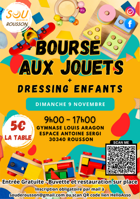Dimanche 9 novembre 2025 que vous soyez vendeur ou acheteur, c’est la journée des bonnes affaires ! La bourse aux jouets & dressing enfants vous ouvre ses portes de 9h à 17h. : entrée gratuite buvette & restauration sur place on vous attend nombreux!