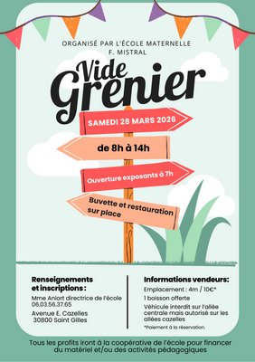 L'école maternelle propose un vide grenier dans le but de collecter des fonds pour la coopérative de l'école, et financer des activités, sorties et/ou matériel pédagogique pour les enfants.