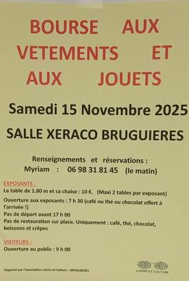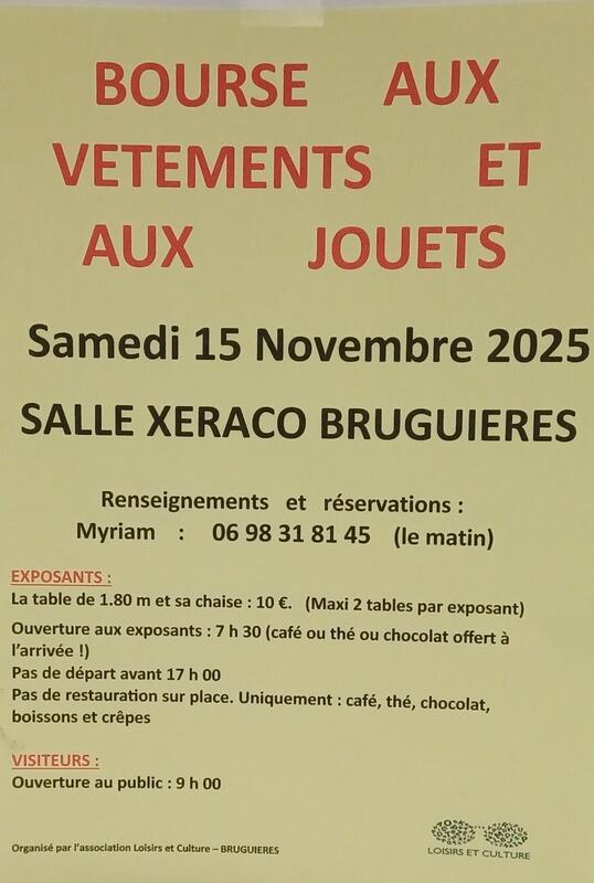 L’association loisirs et culture organise une bourse aux jouets et vêtements le samedi 15 novembre. Cette manifestation se tiendra dans la salle de xeraco.
