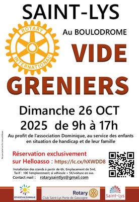 le rotary club de saint-lys porte de gascogne en partenariat et pour l'association dominique, vous donne rendez-vous le dimanche 26 octobre 2025 au boulodrome de saint-lys pour une journée conviviale placée sous le signe du partage. Venez en famille chiner, flâner entre les stands, dénicher des objets insolites ou utiles, et soutenir les actions locales du club.