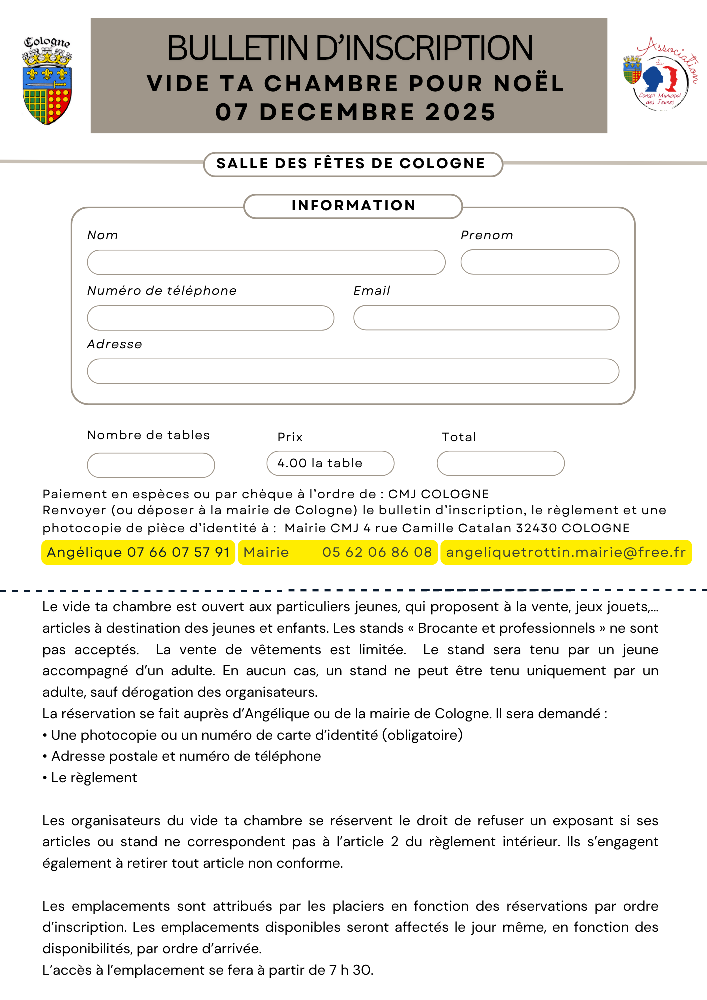 sont acceptés tout article (jeux, jouets, vélos,...) vêtements limités sur les stands (2 braderies annuelles sur cologne)