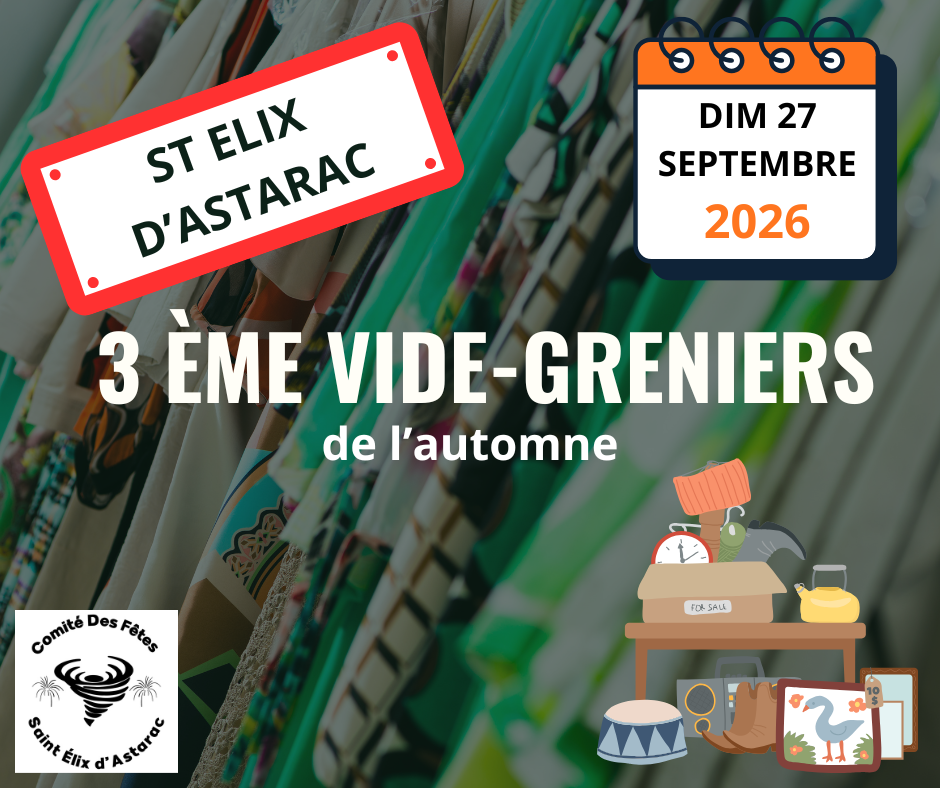 Le comité des fêtes de saint-élix-d’astarac organise son 3ᵉ vide-greniers d’automne, le dimanche 27 septembre, dans les rues du village. Cette année, une soixantaine d’exposants vous attend de 9h à 17h.