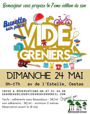 L’association de la résidence beauséjour de cestas gazinet organise un vide grenier le dimanche 24 mai 2026 de 9h00 à 17h00 (installation des exposants à partir de 8h00) ouvert à tous !