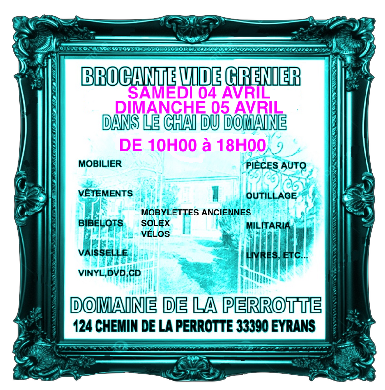 Samedi 04 & dimanche 05 avril 2026 au domaine de la perrotte , vide grenier-brocante au 124 route de la perrotte domaine de la perrotte 33390 eyrans.