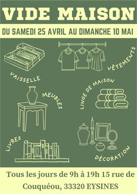 Vide-maison familial avec un large choix d’articles : vaisselle, vêtements, linge de maison (draps, etc.), meubles, électroménager, livres, objets de décoration et quelques bijoux.