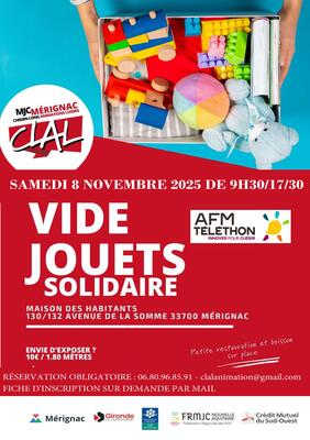 Pour commencer vos cadeaux de noël et donner une seconde vie aux objets, la mjc clal organise un vide jouets le samedi 8 novembre 2025 de 9h30 à 17h30, au sein de la maison des habitants de chemin long mérignac.