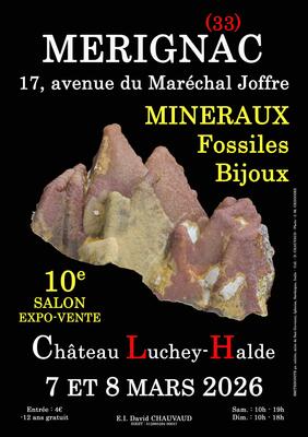 Hexagone mineral vous donne rendez-vous les 7 et 8 mars 2026 pour le 10e salon minéraux fossiles et bijoux de mérignac (gironde). Cet événement se déroulera au château luchey-halde situé 17, avenue du maréchal joffre (quartier d'arlac). Pour animer ce salon, entre 15 et 20 exposants professionnels ou amateurs présenteront au public leurs dernières nouveautés en provenance du monde entier mais aussi des quatre coins de france. Comme dans tous nos salons, un très large choix de minéraux, fossiles et bijoux sera proposé à la vente pour le plus grand bonheur des petits et des grands. Pour répondre toujours plus aux attentes du public, un service d'expertise gratuite sera aussi proposée par l'organisateur à celles et ceux qui souhaitent faire déterminer leurs découvertes minéralogiques ou paléontologiques. Ce rendez-vous incontournable de l'agglomération bordelaise devrait réunir de très nombreux passionnés de la région. Nous mettons tout en œuvre pour que ce week-end remplisse d'émerveillement les passionnés tout en sensibilisant les néophytes et les plus jeunes !
