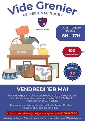 L’as mérignac rugby organise un grand vide-grenier le vendredi 1er mai, au stade robert brettes à mérignac. Ouvert au public de 8h à 17h, cet événement convivial s’adresse aussi bien aux habitants de la commune qu’aux visiteurs des environs.
