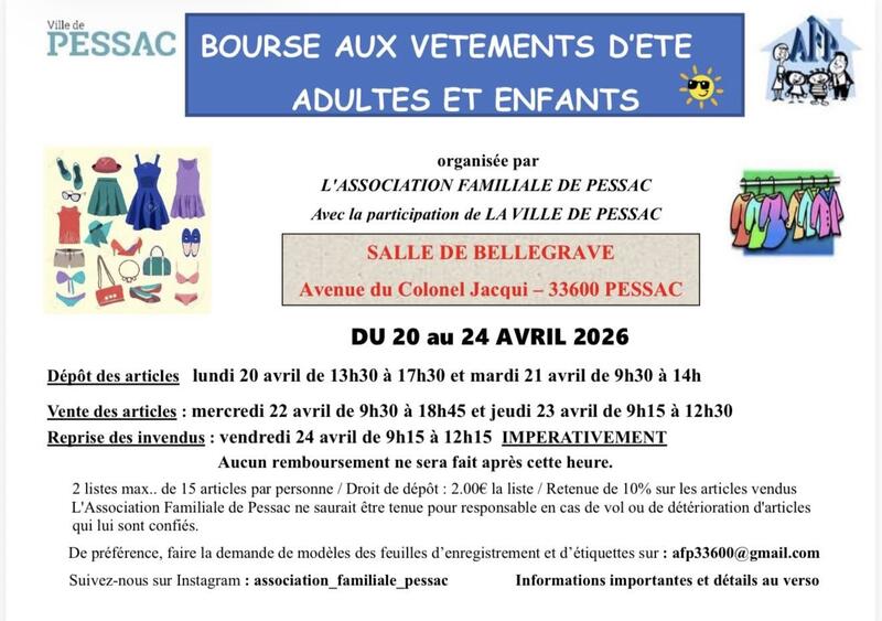 Bourse aux vêtements d'été adultes et enfants organisée par l'association familiale avec la participation de la ville de pessac