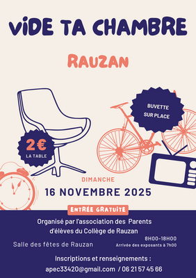 "vide ta chambre" organisé par l'association des parents d'eleves du college de rauzan. Les recettes seront reversées au collège dans le but de financer divers projets pédagogiques