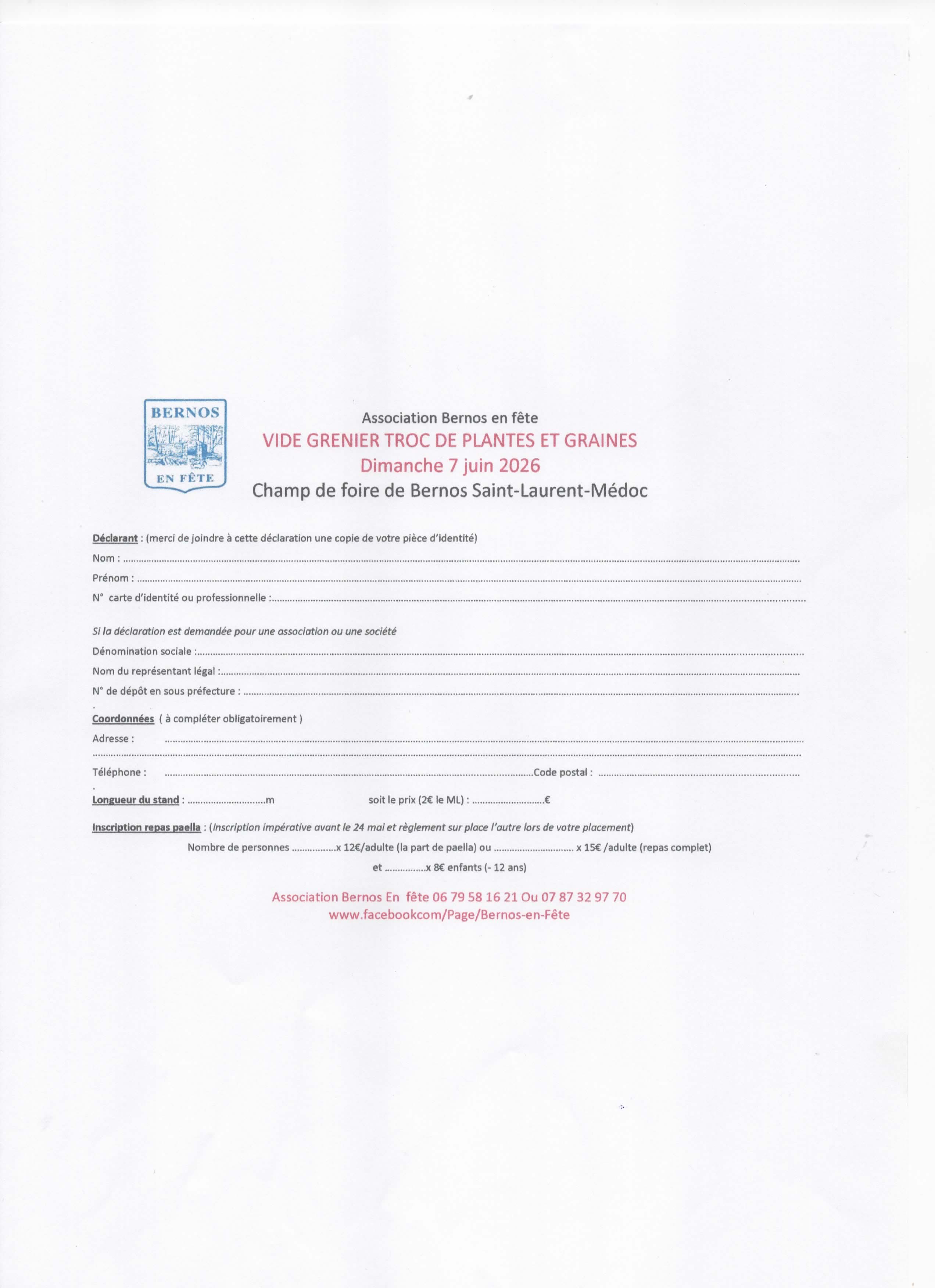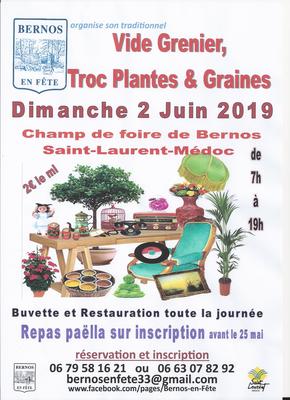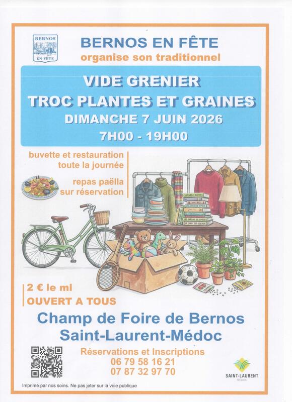 L'association bernos en fête organise son traditionnel vide grenier ,et troc plantes et graines le dimanche 07 juin 2026 de 7h00 à 19h00.Installation à partir de 6h00 pour les exposants. Buvette et restauration toute la journée.