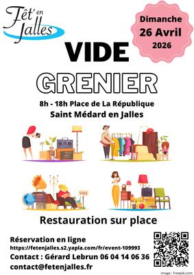Vide grenier organisé par l'association fêt'en jalles sur la place de la république afin de vous permettre de faire de la place dans vos penderies, garage, grenier...