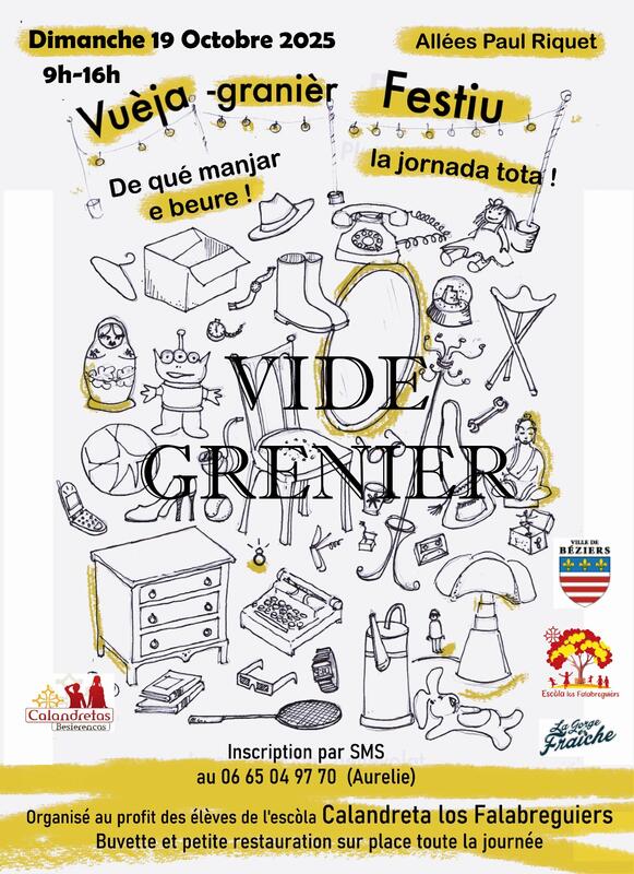 Dimanche 19 octobre 2025 de 9h à 16h 4ème édition du vide grenier calandreta à beziers, sur les allées paul riquet. Organisé par les parents, au profit des élèves de l’école calandreta les falabreguiers! Buvette et petite restauration sur place que vous soyez un vendeur à la recherche d'un espace pour vendre vos objets inutilisés ou un acheteur en quête de bonnes affaires, notre vide-grenier calandreta est l'endroit idéal pour vous.