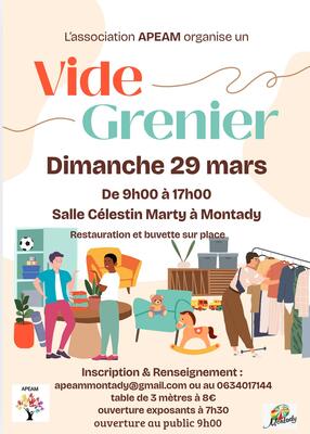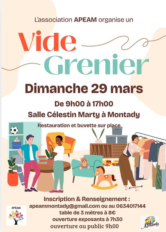 Vide grenier à montady dimanche 29 mars salle célestin marty – montady horaires public : 9h00 – 17h00 buvette et restauration sur place toute la journée. Venez chiner, vendre et passer un moment convivial !
