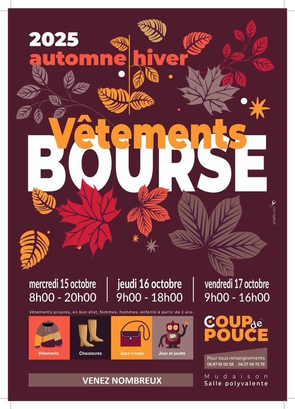 L'association coup de pouce mudaison vous attend 3 jours pour sa bourse aux vêtements annuelle automne hiver. Vous y trouverez des vêtements femmes, hommes et enfants à partir de 2 ans, des chaussures femmes, des sacs, des jeux et jouets. Le mercredi 15 octobre de 8h00 à 20h00, le jeudi 16 de 9h00 à 18h00 et le vendredi 17 de 9h00 à 16h00. Venez nombreux