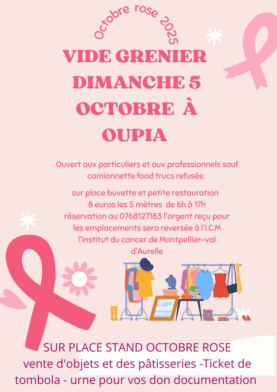 La serre pètanque de oupia organise un vide grenier pour octobre rose l argent des emplacements seront reversés au chu val d'aurelle de montpellier.Merci de venir nombreux