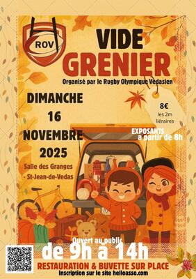 le rugby olympique védasien organise son traditionnel vide-grenier le dimanche 16 novembre 2025 à la salle des granges à saint-jean-de-védas. C’est l’occasion idéale pour chiner, faire de bonnes affaires et partager un moment convivial en famille ou entre amis.