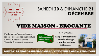 Vide maison - brocante où vous retrouverez des vêtements (femme/homme/enfant), des jouets, de l'ameublement, de la décoration, mais aussi de la vaisselle, de la décoration et de la vaisselle vintage, de meubles anciens et même des tableaux signés. De belles idées de cadeaux de noël à petits prix.