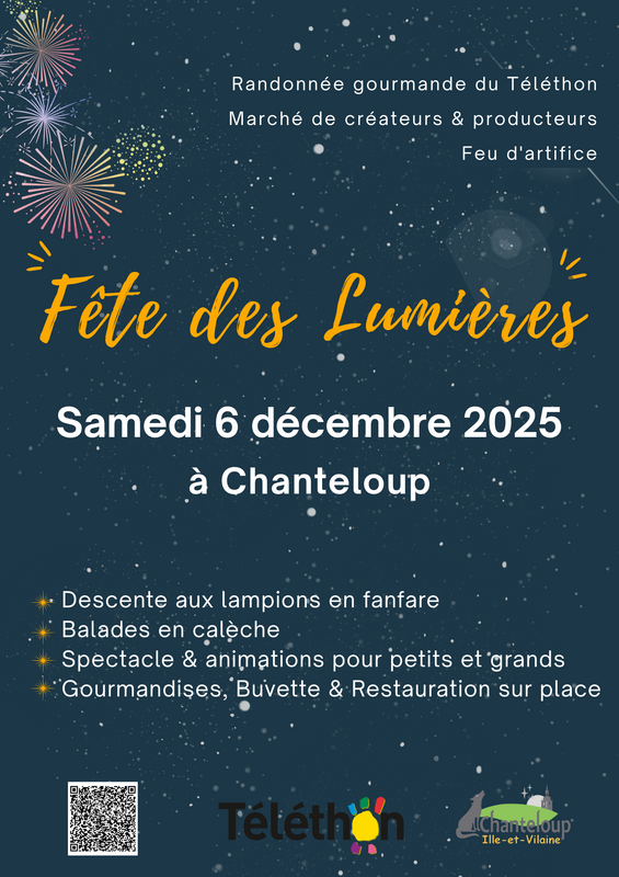la magie de l’hiver revient à chanteloup pour la 5ᵉ édition de la fête des lumières ! Toute la journée, petits et grands pourront profiter d’animations et de surprises pour tous les goûts. Début de la journée avec l’apéritif de la randonnée gourmande, suivi des balades en calèche et du marché des créateurs et producteurs où chichis, crêpes, gaufres et confiseries de noël raviront les papilles. Les enfants s’amuseront sur le mini-manège, le tunnel crocodile et le tunnel de jeux interactifs, tandis que les plus grands pourront tester leurs réflexes sur le babyfoot géant, la table ips, la réalité virtuelle ou profiter de sports dans le noir. Conte, spectacles de danse, chorale et magie déambulatoire viendront ponctuer la journée. À 18h30, le moment tant attendu : l’allumage des illuminations, suivi à 20h15 d’un feu d’artifice féérique depuis kantlou park. Sur place, restauration avec tartiflette, burgers et kebabs. Tous les bénéfices seront reversés au téléthon. Une journée pleine de lumière, de joie et de partage vous attend : notez la date dans vos agendas et venez nombreux !
