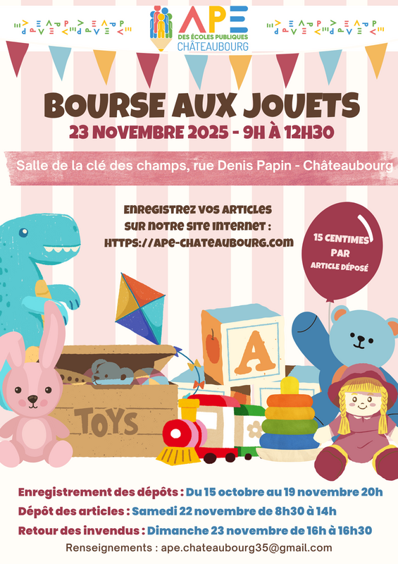 L’association des parents d’élèves des écoles publiques de châteaubourg organise sa traditionnelle bourse aux jouets !
