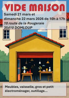 Articles à vendre : mobilier (buffets, tables, chaises, armoires, petit mobilier...), vaisselle, petit et gros électroménager (certains ayant très peu servi), jeux de société, matériel de bricolage (visseries, outils, échelles...), portes de placard...