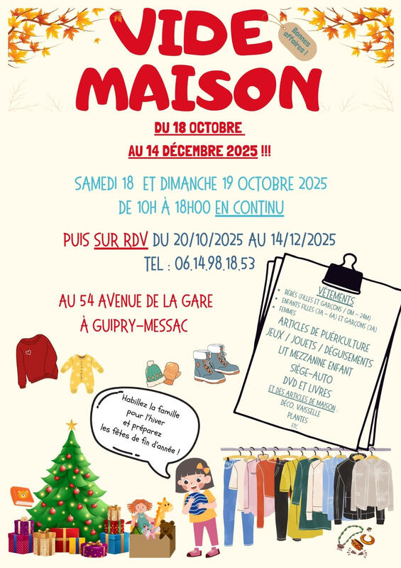 Vide maison les 18 et 19/10/25 de 10h à 18h puis sur rdv du 20/10/25 au 14/12/2025.