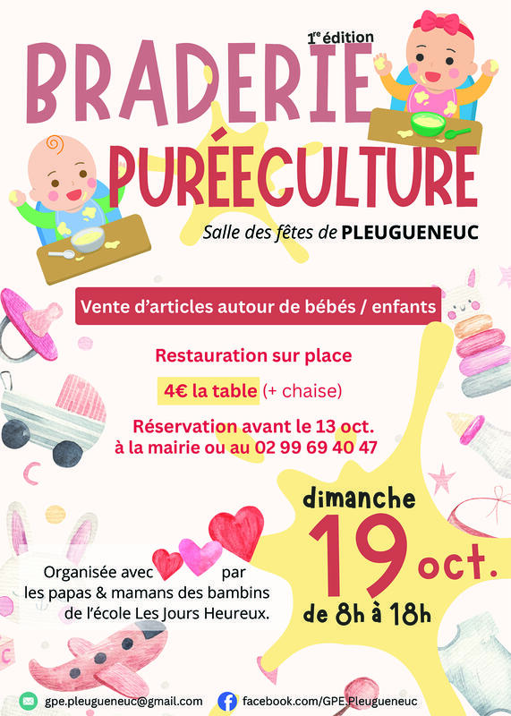 Vêtements bébé et enfant, jouets, livres, poussettes, matériel de puériculture… venez faire de bonnes affaires et donner une seconde vie aux affaires des petits bouts ! Une belle occasion de chiner, d’économiser et de partager un moment convivial entre familles. Restauration sur place, événement organisé par les papas & les mamans des bambins de l'école les jours heureux.