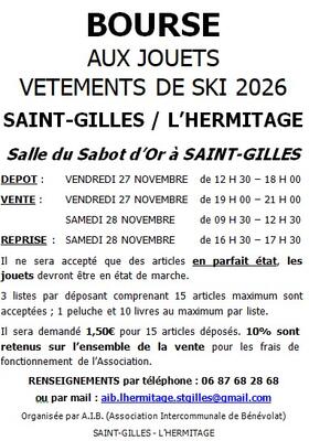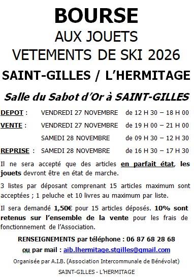 Venez faire des affaires à notre bourse aux jouets, livres et articles de ski vous pourrez y trouver des jouets, des livres pour tous les âges et pour tous les goûts ainsi que tout le nécessaire pour le ski (vêtements, chaussures, ... ). Notre bourse a lieu : salle du sabot d'or à saint-gilles le vendredi 28 novembre et le samedi 29 novembre 2026