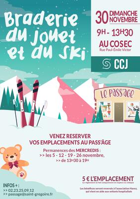 Comme chaque année, le conseil municipal des jeunes et le conseil consultatif des jeunes organisent la braderie du jouet et du ski qui aura lieu le dimanche 30 novembre dans la salle du cosec de 9h à 13h30.