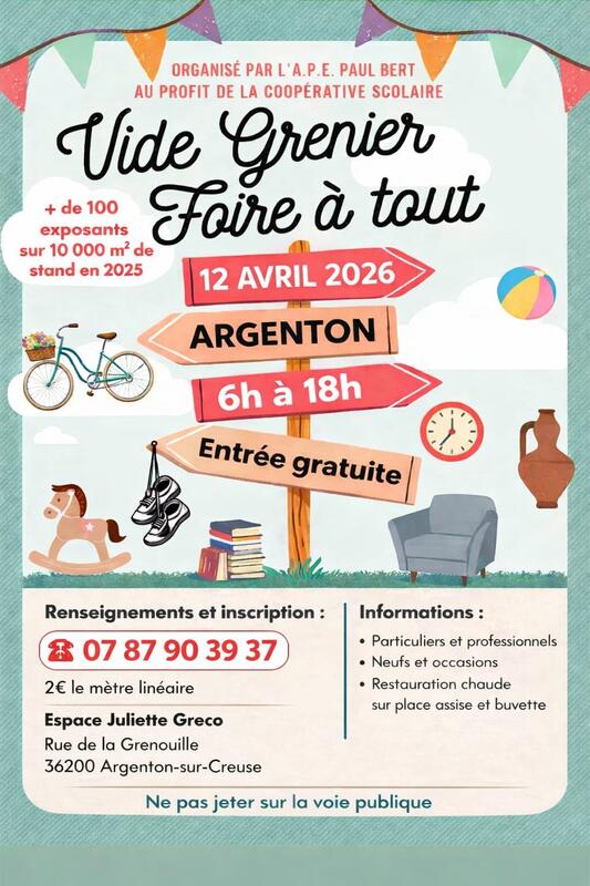 Foire à tout, particuliers et professionnels, neufs et occasions, restauration chaude sur place assise et buvette