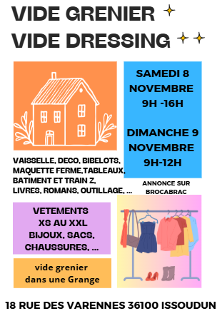 Bonjour à tous, j'organise un vide grenier et vide dressing avec plusieurs personnes et ça se fera dans une grange à l'abri. Il y aura beaucoup d'articles divers tableaux, romans, livres, bibelots, vaisselle ancienne et moderne, maquette ferme, bâtiment et train échelle z , outillage, ... Et sans parler du vide dressing du xs au xxl avec beaucoup d'accessoires. Au plaisir de vous rencontrer ! Plus d'infos sur l'affiche