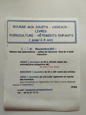 Mardi 4 novembre de 9 heures à 18 heures 30 dépôt des articles , vente de 19 heures à 21 heures , mercredi 5 novembre vente des articles de 9 heures à 18 heures , jeudi 6 novembre de 14 heures à 18 heures règlement et reprise des invendus ( tous les articles et règlements non repris ce jour resteront acquis à l'association)