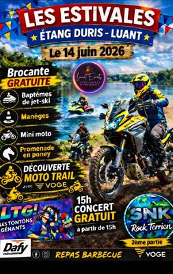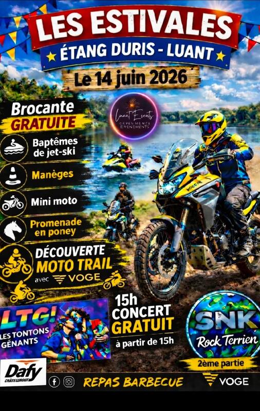 Les estivales – étang duris à luant le 14 juin 2026 venez profiter d’une journée exceptionnelle en famille ou entre amis dans un cadre naturel au bord de l’étang ! Au programme : brocante gratuite (sur réservation) baptêmes de jet-ski manèges mini moto promenades en poney découverte moto trail concert gratuit à partir de 15h avec : ltg! – les tontons gênants snk rock terrien (2ème partie) repas barbecue sur place pour se régaler une ambiance festive, conviviale et pleine d’animations pour tous les âges ! Réservation brocante