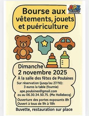 L’ape de l’école de poulaines organise sa première grande bourse aux vêtements, jouets et articles de puériculture ! Venez faire de bonnes affaires pour vos enfants dans une ambiance conviviale ouverture au public : de 9h à 18h buvette et restauration sur place venez nombreux pour une journée pleine de trouvailles et de bonne humeur !