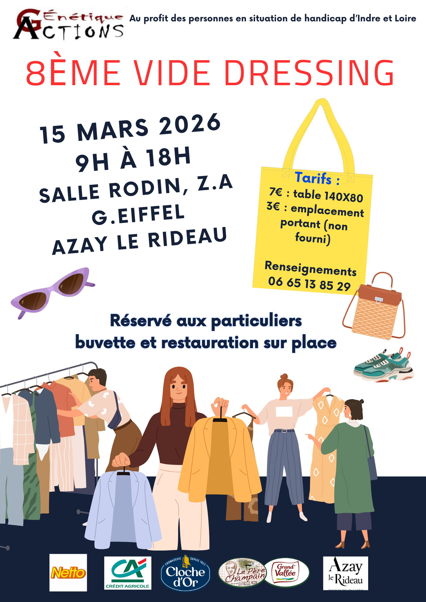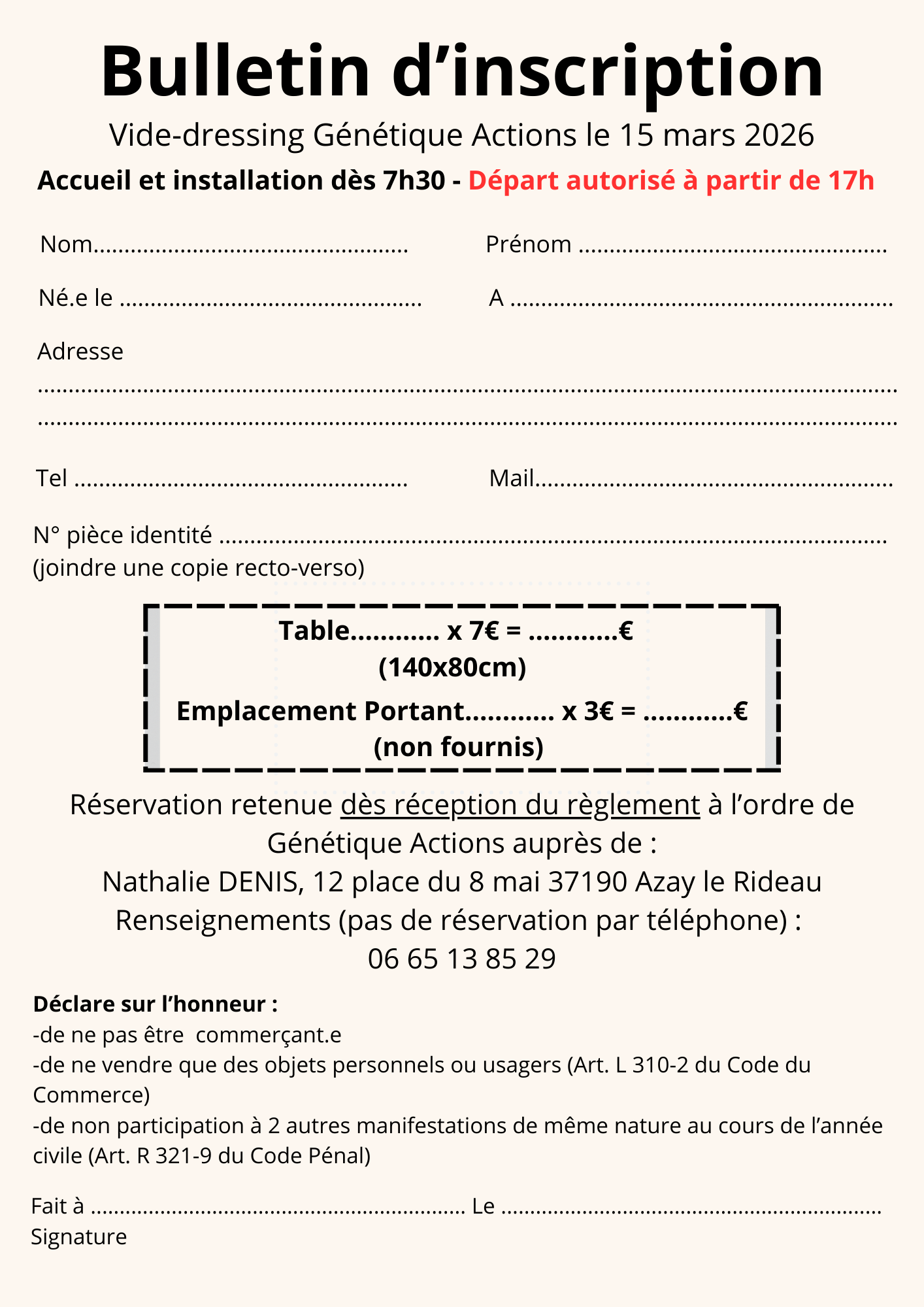 Vide dressing (vêtements, sac à mains, chaussures). Salle polyvalente d'azay le rideau de 9 h à 18 h. Accueil des exposants à partir de 8 h. 7 € la table. 1,40 m X 0.80 cm 3 € le portant (non fourni) renseignements et inscriptions auprès de nathalie –. Règlement par chèque à l'ordre de : génétique actions. Adresse : madame denis nathalie. 12 place du 8 mai. 37 190 azay le rideau. Inscriptions sans règlement non pris en compte. Buvette et restauration sur place.