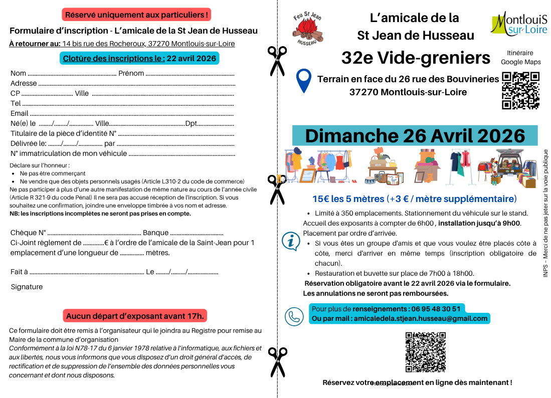 Bienvenue à la 32ème édition de notre brocante, un rendez-vous incontournable pour les amateurs de bonnes affaires et de convivialité ! Organisée par l’amicale de la st jean de husseau, cette journée promet une ambiance chaleureuse et festive dans le cœur de notre village.
